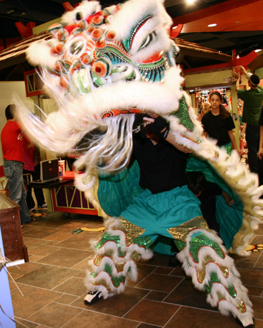 Another popular tale comes from Southern China’s Kwangtung province. A savage beast would appear once a year to terrorize a small village. A visiting monk, having witnessed the terror, instructed the villagers to build a "monster" to scare off the menace. They fashioned a large head from bamboo covered in bright paper, and a body was sewn together from long pieces of cloth. They also filled bamboo shoots with gunpowder. When the new year arrived the beast returned to terrorize the villagers, but was greeted by the "monster" manned by two of their best martial artists. These "dancers" started scuffling about, bringing the bamboo and paper construction to life, while the villagers banged on pots and pans and threw their homemade firecrackers. The frightened beast scurried away, never to return again.